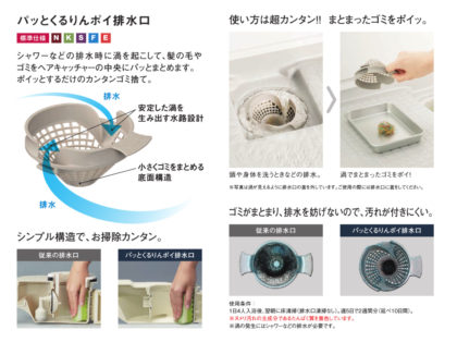 くるりんポイ排水口は渦のチカラで髪の毛や汚れをまとめてくれるのでカンタンごみ捨て!